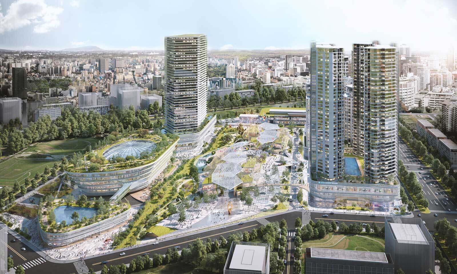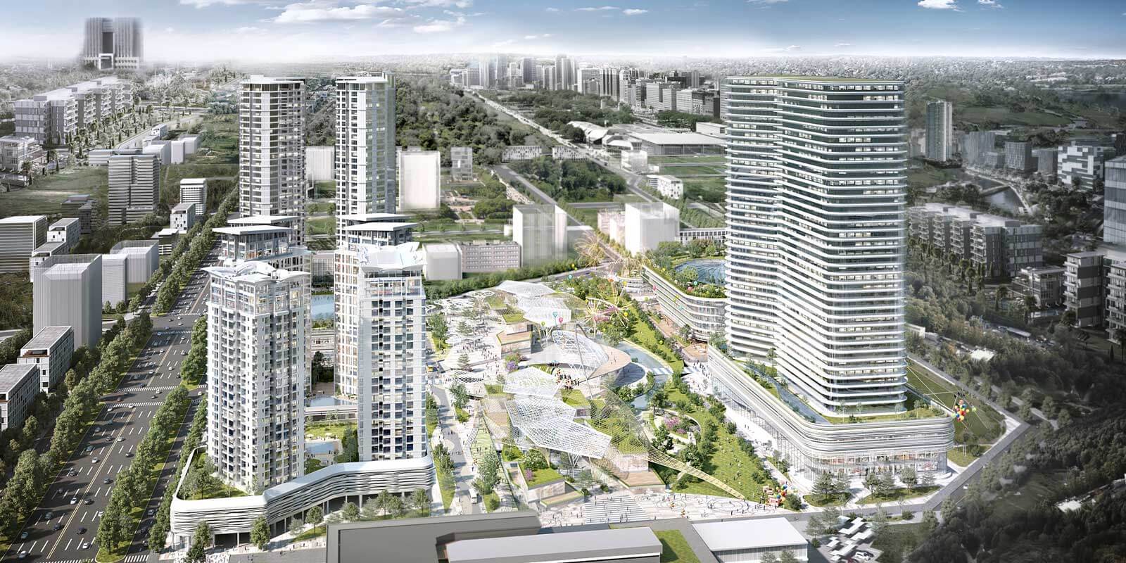 Khi lập quy hoạch tổng thể cho khu vực này, với ý tưởng chủ đạo “ALWAYS NEW!”, chúng tôi đã tiến hành phân tích môi trường xung quanh khu đất và điều kiện giao thông, đồng thời phân chia khu vực thành ba nhóm chủ đề chính: khu dân cư, thương mại và văn phòng, được bao quanh bởi bảy yếu tố nền tảng: thiên nhiên, văn hóa, làm việc, giáo dục, giao thông, y tế và ICT (công nghệ thông tin và truyền thông).