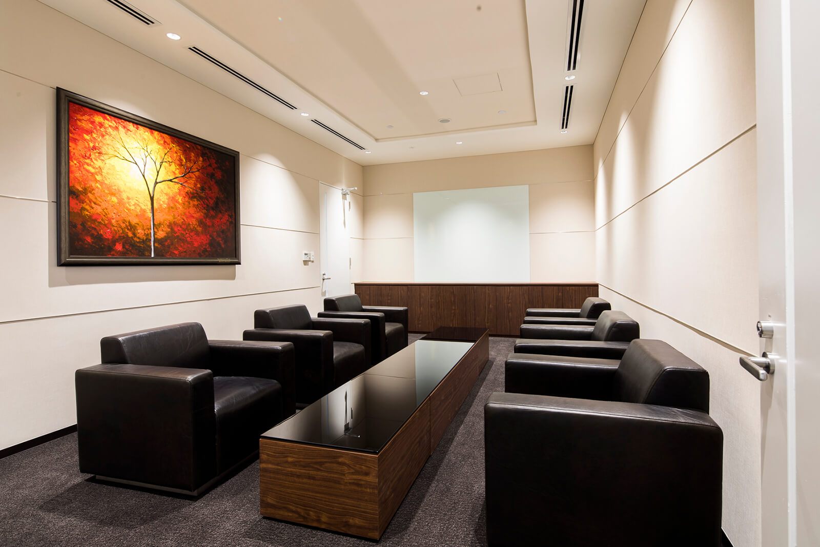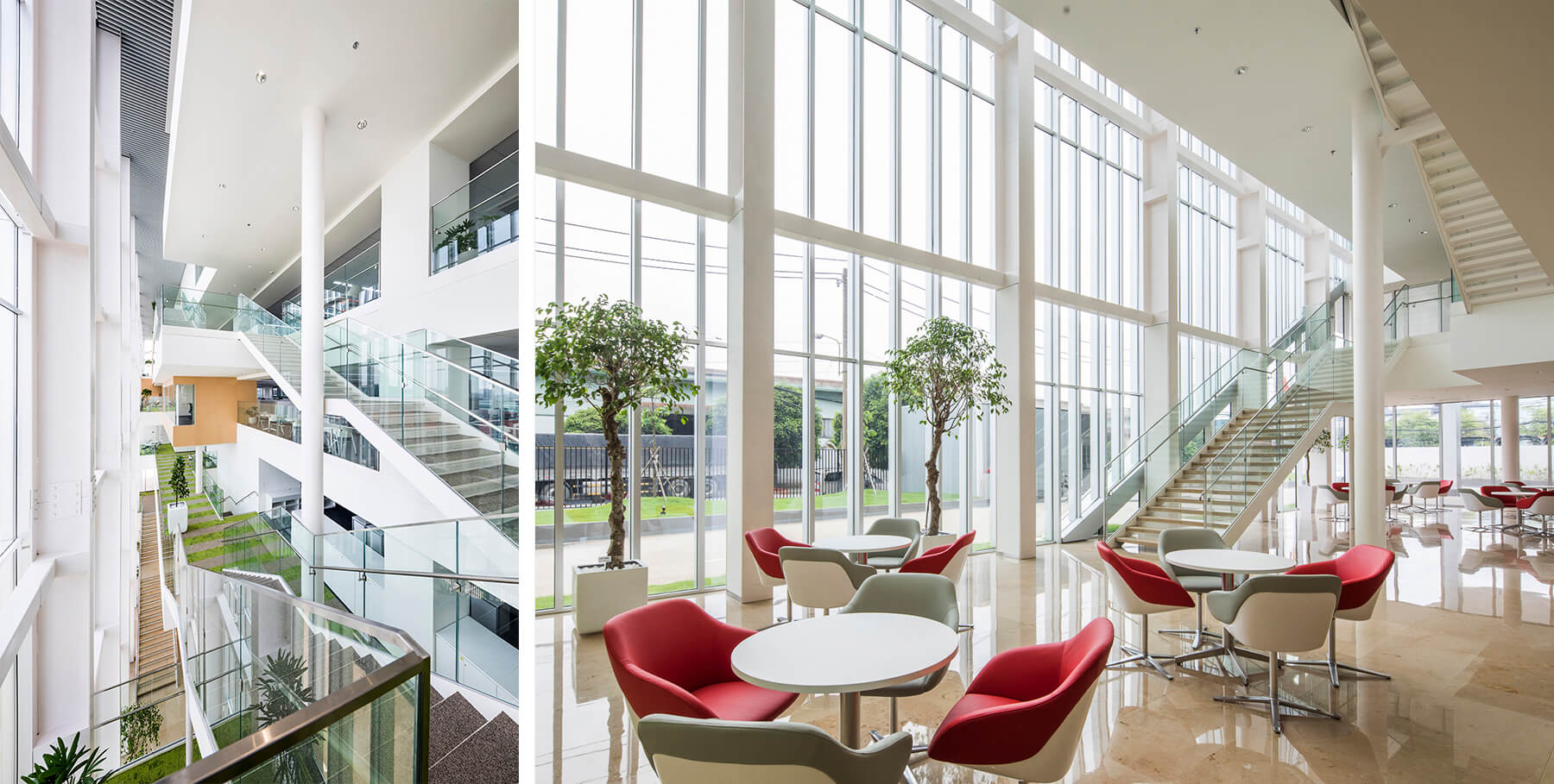 Mặt đứng công trình thiết kế tạo cảm giác chiều sâu thông qua sự kết hợp giữa các thanh nhôm đứng với kính. Không gian thông tầng lớn được bố trí gần mặt tiền kính của tòa nhà, xuyên suốt toàn bộ các tầng, giúp các không gian làm việc ở từng tầng được kết nối và đón ánh sáng tự nhiên, từ đó góp phần thúc đẩy sự giao lưu và tương tác giữa các bộ phận trong công ty.