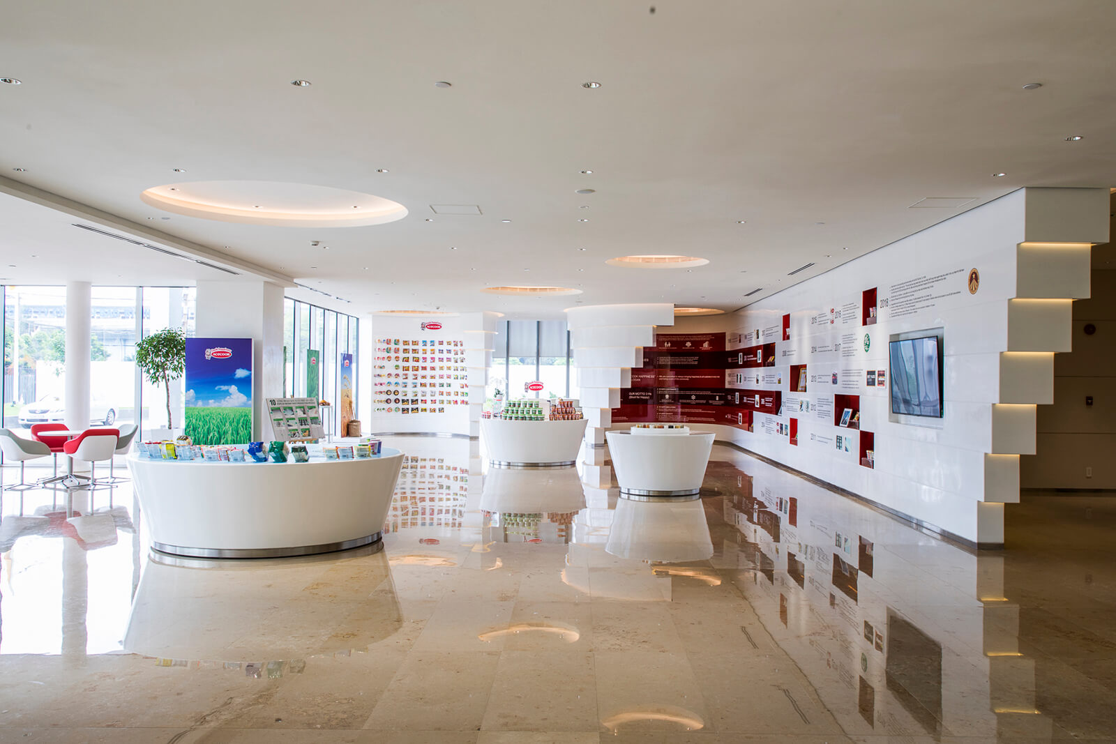 Ý tưởng thiết kế chính của công trình chính là “tạo ra môi trường làm việc thân thiện giúp nhân viên tái tạo lại nguồn năng lượng, hứng khởi và hài lòng hơn với công việc”. Thiết kế đã khéo léo lồng ghép các yếu tố đặc trưng của hình ảnh ly mì vào thiết kế nội thất khu vực sảnh, qua đó tăng cường nhận diện thương hiệu của doanh nghiệp.